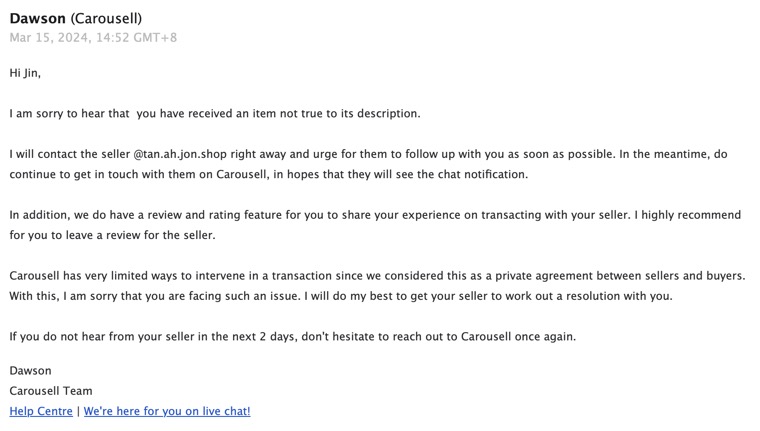 The next course of action is to report it to Carousell. However, I wasn’t hopeful because he didn’t even accept the offer! Furthermore, the transaction did not go through Carousell Protection. Despite this, I reported it anyway. Below is their response:
