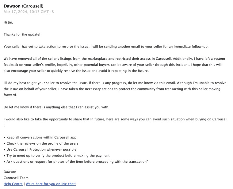 “We have removed all of the seller’s listings from the marketplace and restricted their access in Carousell. Additionally, I have left a system feedback on your seller’s profile.”