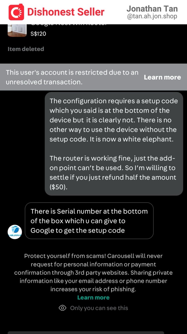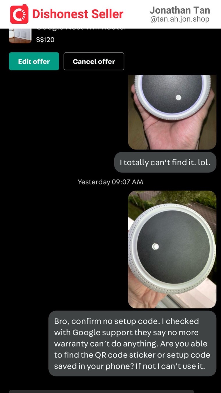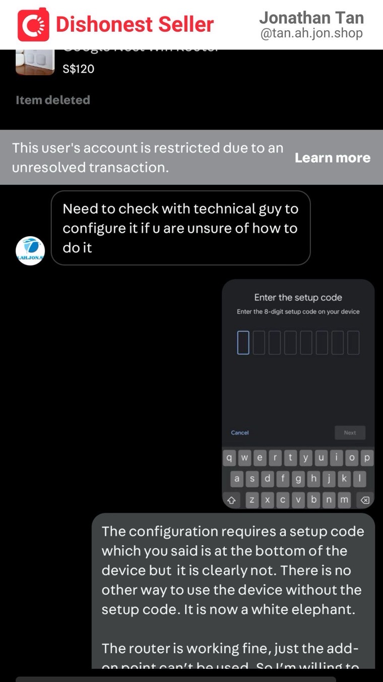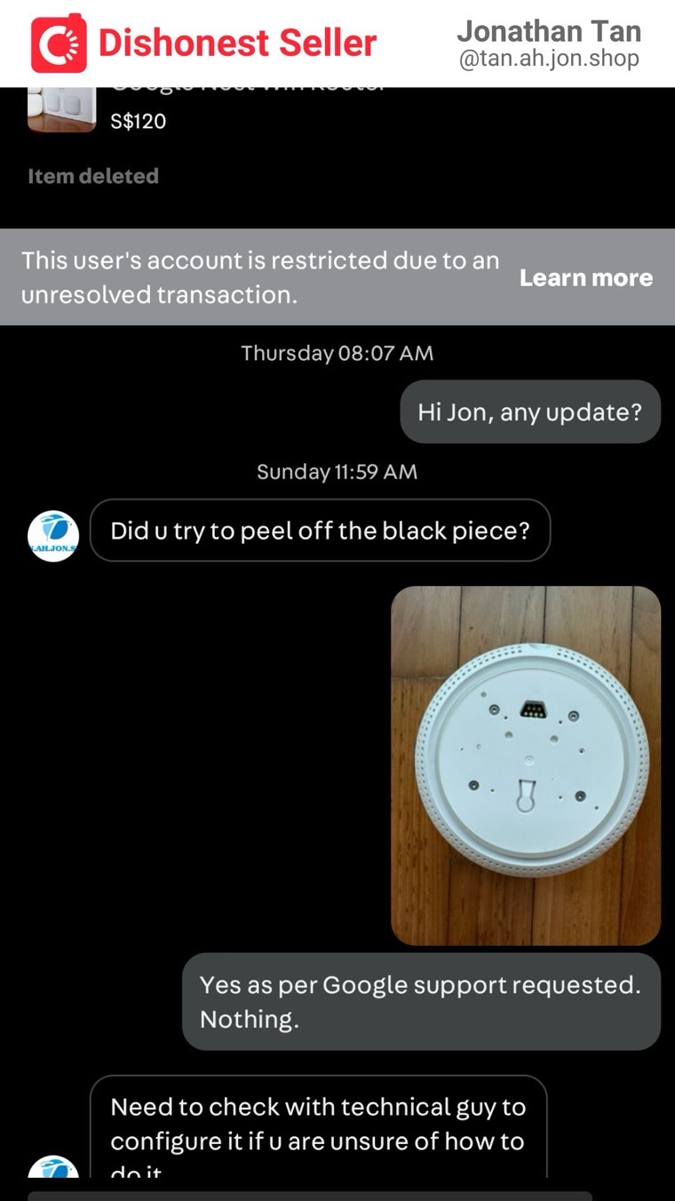 I was disappointed that despite my carefulness, I still encountered a dishonest person. The listing consists of two devices: a Google Nest wifi router and an add-on point. While the router is actually working fine, the add-on point is now essentially useless. So technically, if he were to refund me $50, I would be satisfied. The problem is, he doesn’t even intend to resolve this issue at all. This is morally incorrect and dishonest, and I cannot easily let it go.