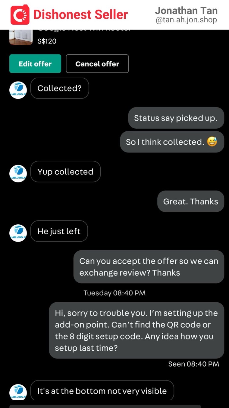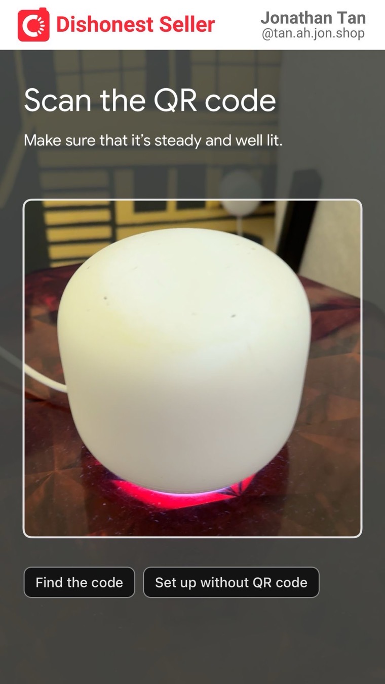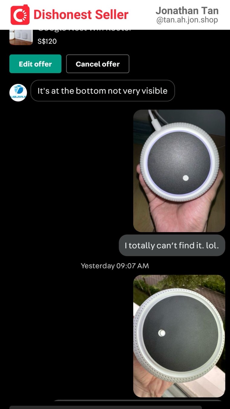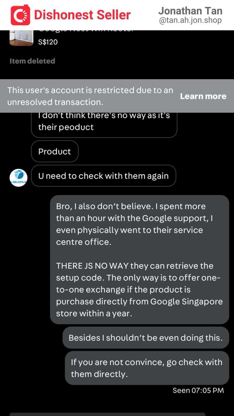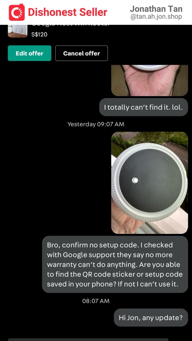 I was disappointed that despite my carefulness, I still encountered a dishonest person. The listing consists of two devices: a Google Nest wifi router and an add-on point. While the router is actually working fine, the add-on point is now essentially useless. So technically, if he were to refund me $50, I would be satisfied. The problem is, he doesn’t even intend to resolve this issue at all. This is morally incorrect and dishonest, and I cannot easily let it go.