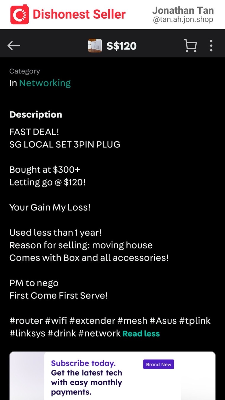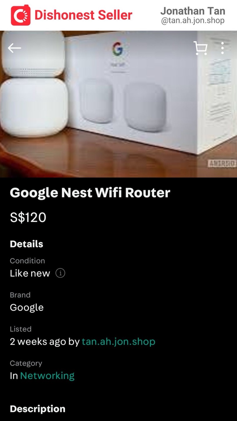 With these criteria, I’ve had no issues until recently. I found Jonathan Tan’s listing selling a Google Nest wifi router. He joined Carousell 8 years and 10 months ago and has 62 5-star reviews!