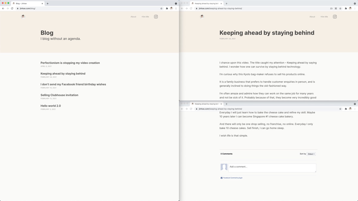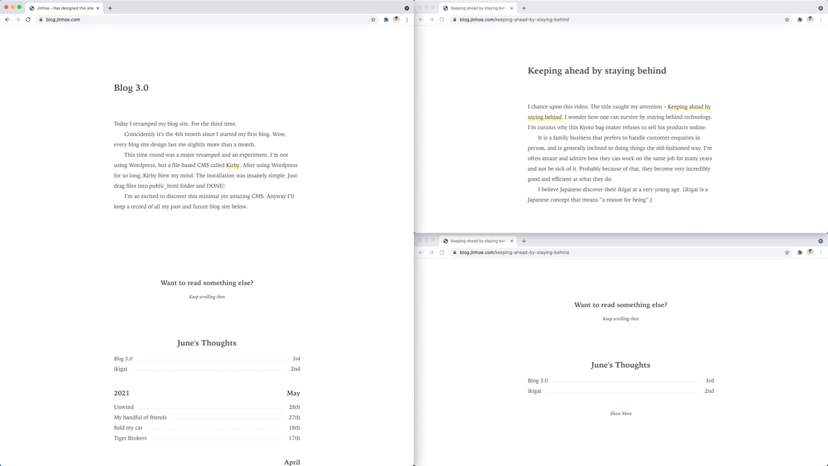 This time round was a major revamped and an experiment. I’m not using Wordpress, but a file-based CMS called Kirby. After using Wordpress for so long, Kirby blew my mind. The installation was insanely simple. Just drag files into public_html folder and DONE!