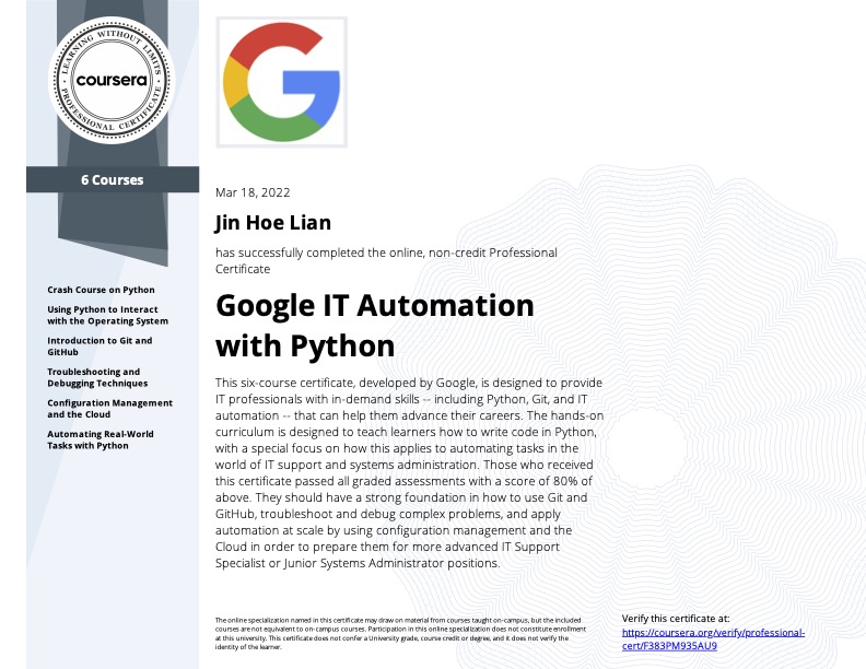 Anyway I intent to specialize in Python language. So moving forward I will work on personal project to solve my own problems with Python. Hope to publish my projects in GitHub too.